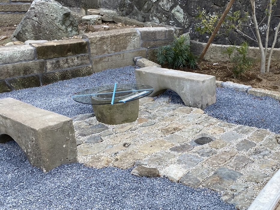 U字の石は人が腰掛けるには少し高かったので、ちょうどいい高さに埋めてもらいました。
