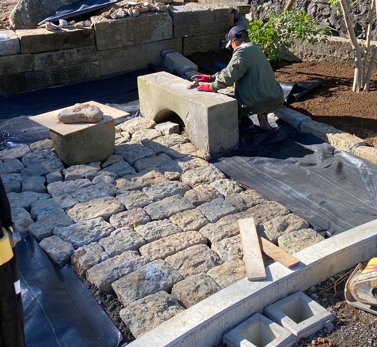 石畳は、こちらも敷地内で解体した間知石を再利用しました。