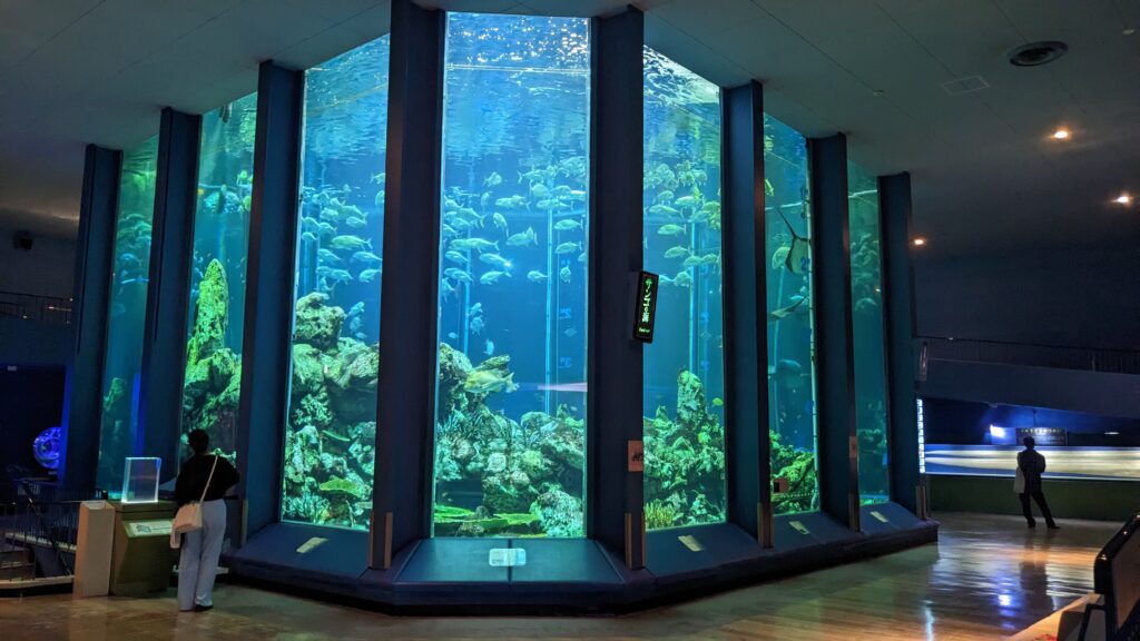 高さのある水槽は海の生態系を表現するかのように、水槽上部下部で異なる魚群を見て楽しめました。