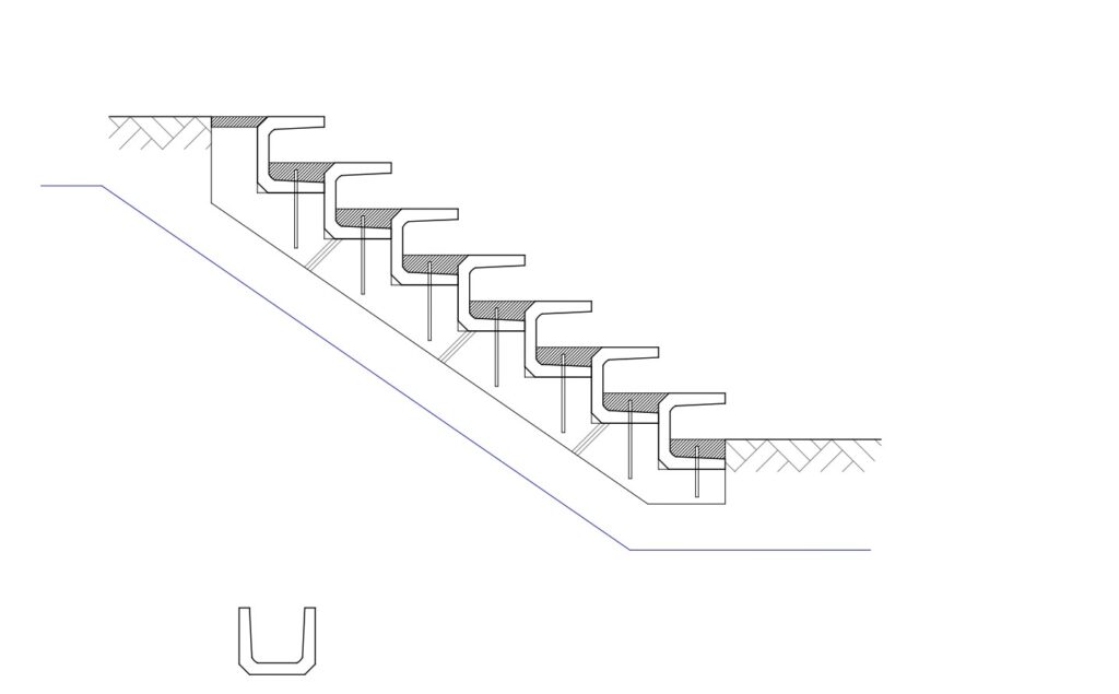 スリット階段というと薄いコンクリートの板が重なっている様が理想ですが、型枠を組み、全体をコンクリート打設で成形するには強度や仕上がり精度を勘案すると、一段一段の板厚がかなり厚くなります。