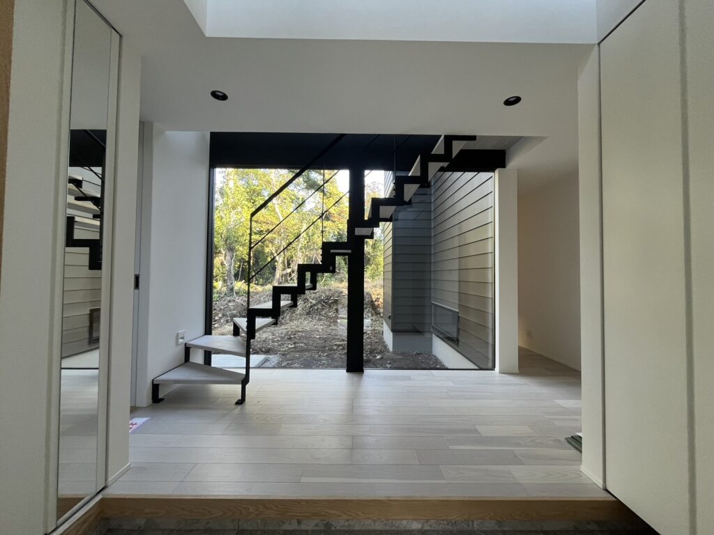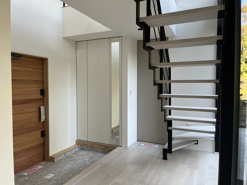玄関を開けると大きなFIX窓と鉄骨階段がお出迎え