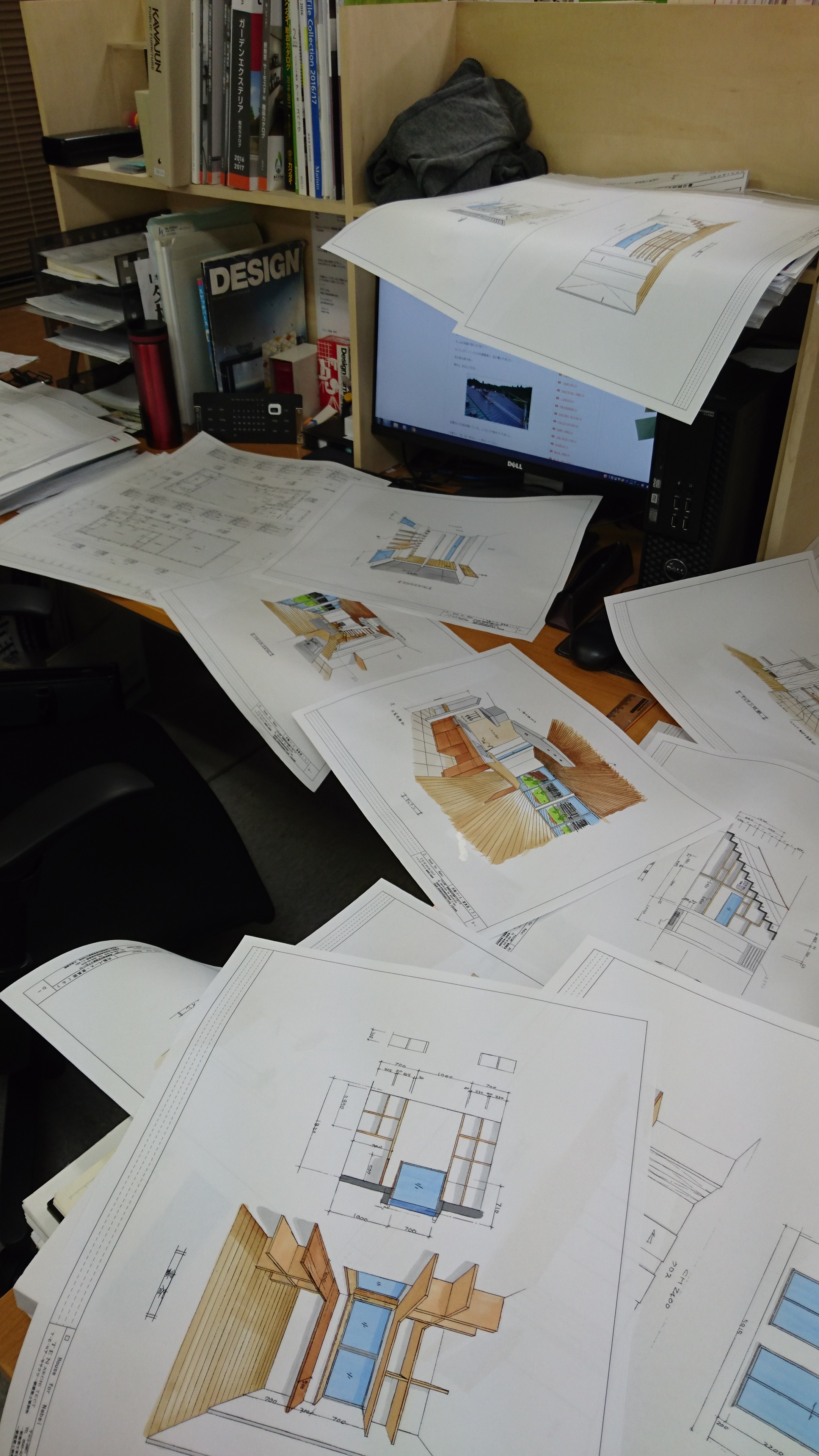 さすがに10枚となるとデスクに溢れてしまいますが、前回のお打ち合わせで変更された箇所が思い通りに変更されてグレードアップしていたり、平面図ではイメージし難い部分が、新たなパースによって理解して頂けるので、外すことが出来ない資料です。